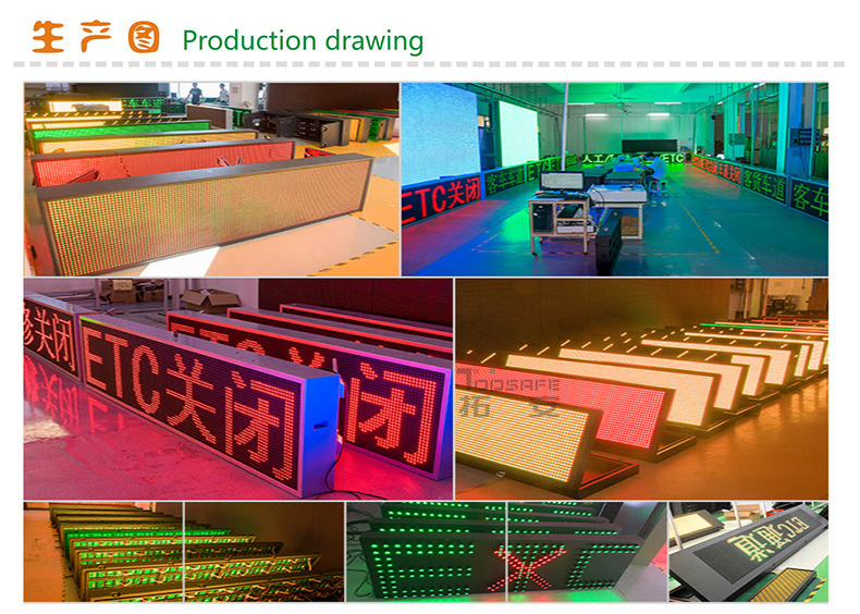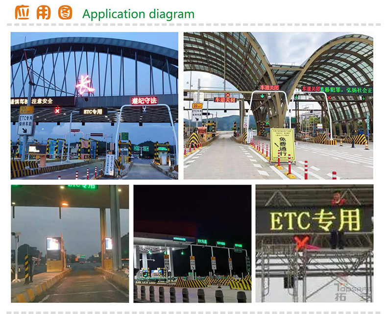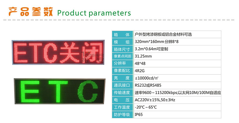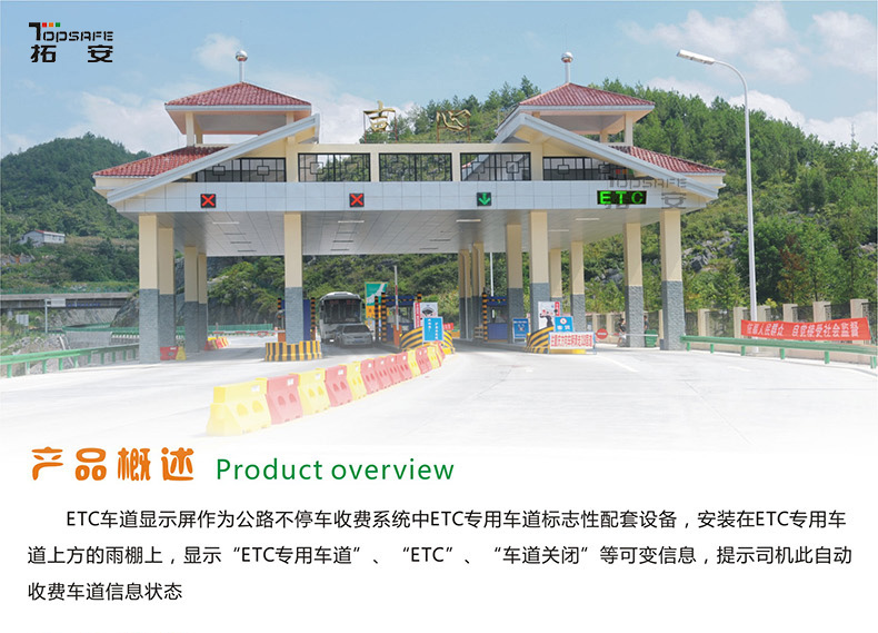 ETC車道顯示屏作為公路不停車收費(fèi)系統(tǒng)中ETC專用車道標(biāo)志性配套設(shè)備,安裝在ETC專用車道上方的雨棚上,顯示“ETC專用車道”、“ETC”、“車道關(guān)閉”等可變信息,提示司機(jī)此自動(dòng)收費(fèi)車道信息狀態(tài)