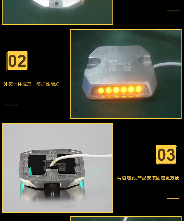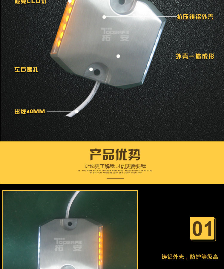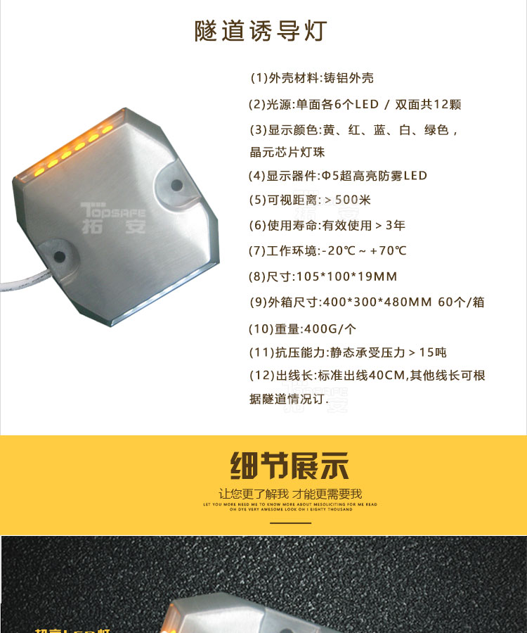 產(chǎn)品概述:誘導(dǎo)燈是一種主動(dòng)發(fā)光的產(chǎn)品,在視線不良的環(huán)境下清晰勾勒道路輪廓,指示誘導(dǎo)安全通行,保障交通安全的指示標(biāo)志。