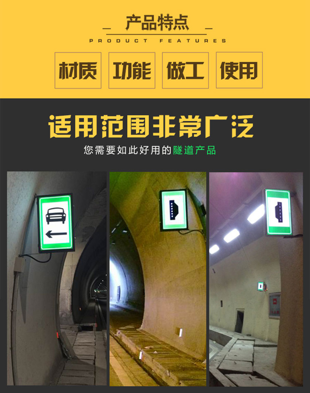 1.隧道電光標志采用LED發(fā)光技術,是一種新型的隧道標志。用于隧道緊急狀態(tài)下提供道路信息(如指示道路方向,指示消防通道和設施等)起到疏散人群和車輛的作用,保障隧道安全通行,也可為隧道節(jié)省用電運營費用。