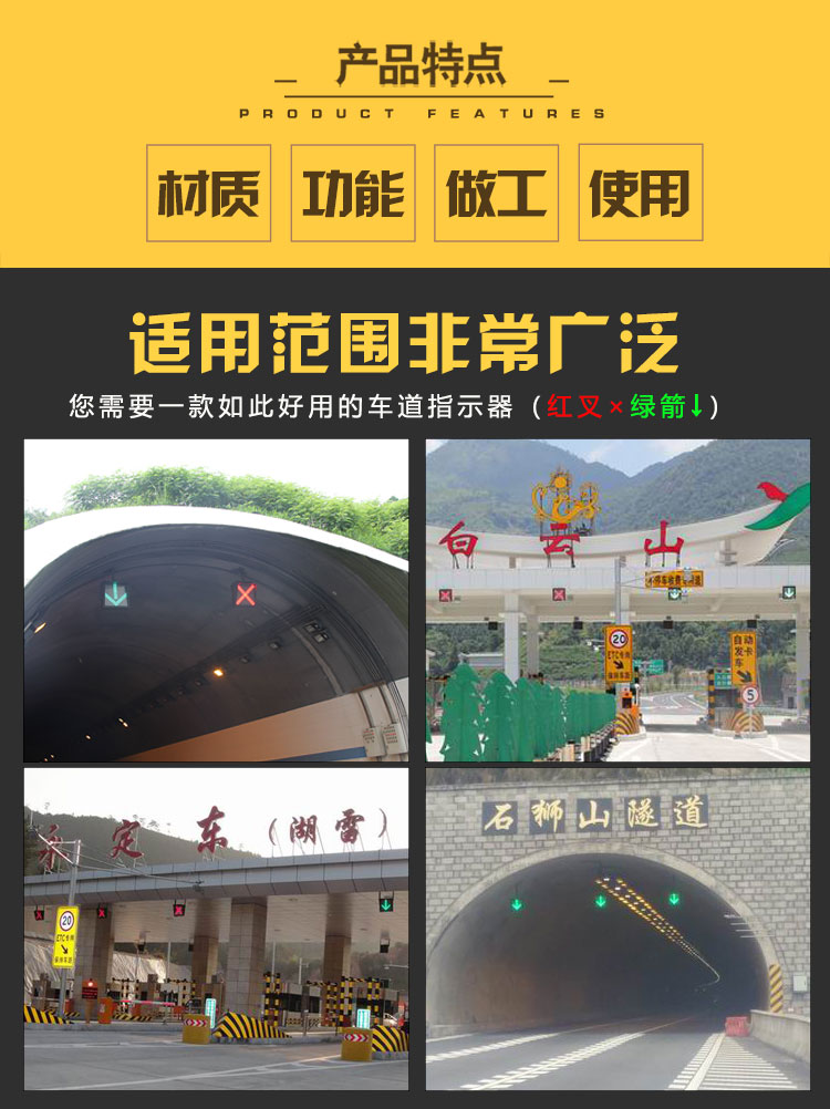 車道指示器常出現(xiàn)的在收費(fèi)站和隧道口,是一種交通指示燈,讓駕駛?cè)藛T能夠直觀的看到,提示本車道車輛按指使方向通行。對(duì)于交通的流暢度有很大的作用。