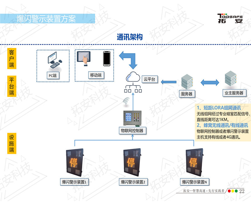 智能網(wǎng)聯(lián)爆閃警示裝置系統(tǒng)集成了遠(yuǎn)程控制、振動(dòng)傾斜檢測(cè)、電量檢測(cè)、事件和運(yùn)行狀態(tài)反饋等功能,是一種主機(jī)帶定位功能,從機(jī)短距組網(wǎng)無線同步閃爍的警示燈,多用于保安亭、安保執(zhí)勤點(diǎn)、匝道口、學(xué)校門口、交叉路口、轉(zhuǎn)彎、多行人通過等存在安全隱患的危險(xiǎn)路段,尤其是用于受山洪、泥石流、滑坡等災(zāi)害嚴(yán)重威脅的高速公路橋梁,實(shí)現(xiàn)了實(shí)時(shí)安全警示作用。